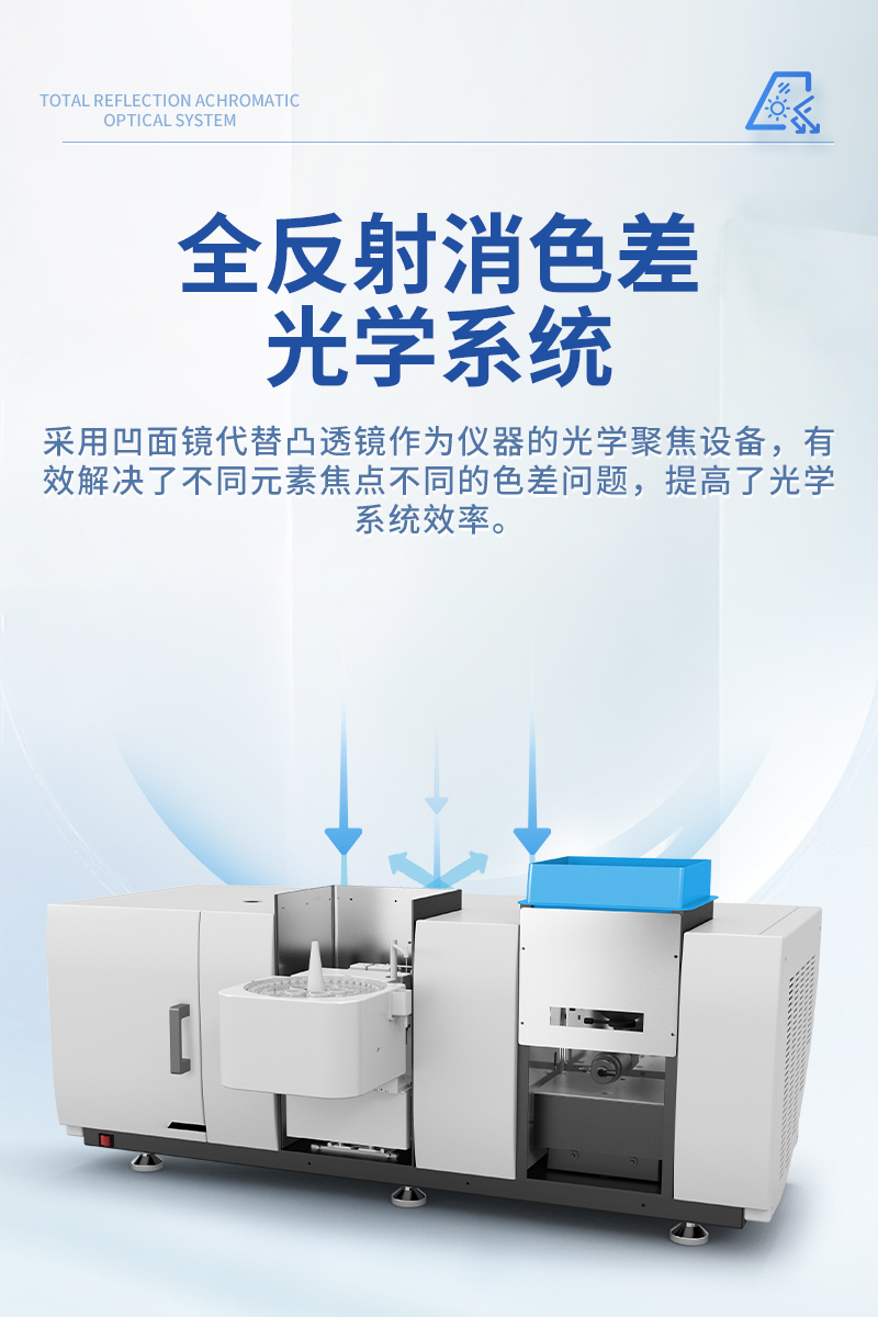 采用凹面鏡代替凸透鏡作為儀器的光學(xué)聚焦設(shè)備,有效解決了不同元素焦點(diǎn)不同的色差問題,提高了光學(xué)系統(tǒng)效率。