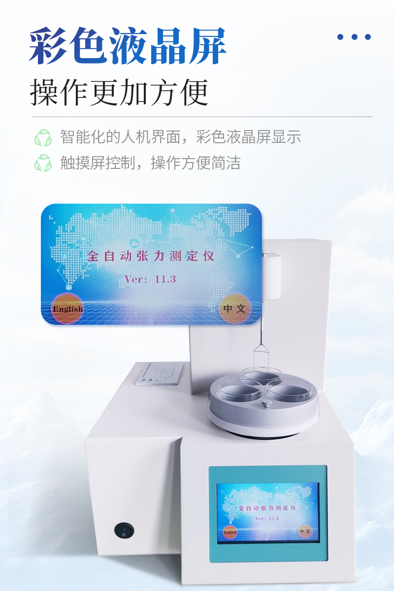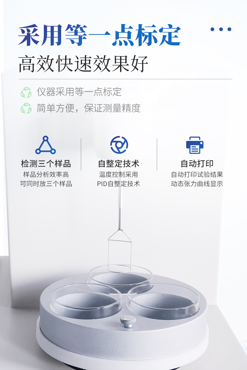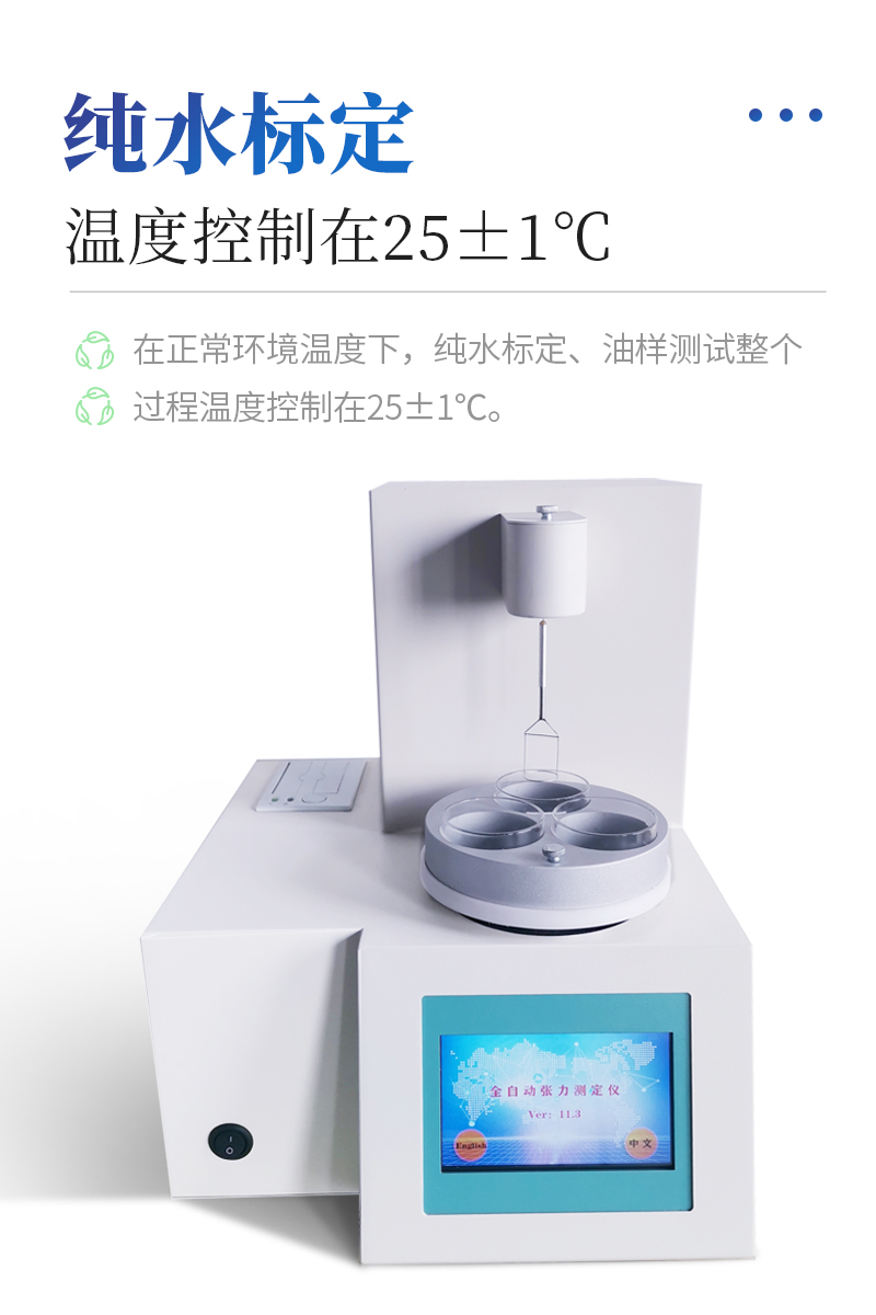 儀器特點(diǎn)★ 在正常環(huán)境溫度下,純水標(biāo)定、油樣測試整個(gè)過程溫度控制在25±1℃?!?溫度控制采用PID自整定技術(shù)★ 樣品分析效率高,可同時(shí)放三個(gè)樣品★ 使用不同測量環(huán)儀器自動(dòng)修正參數(shù)★ 自動(dòng)打印試驗(yàn)結(jié)果,動(dòng)態(tài)張力曲線顯示★儀器采用等一點(diǎn)標(biāo)定,簡單方便,保證測量精度;★高清晰彩色觸摸