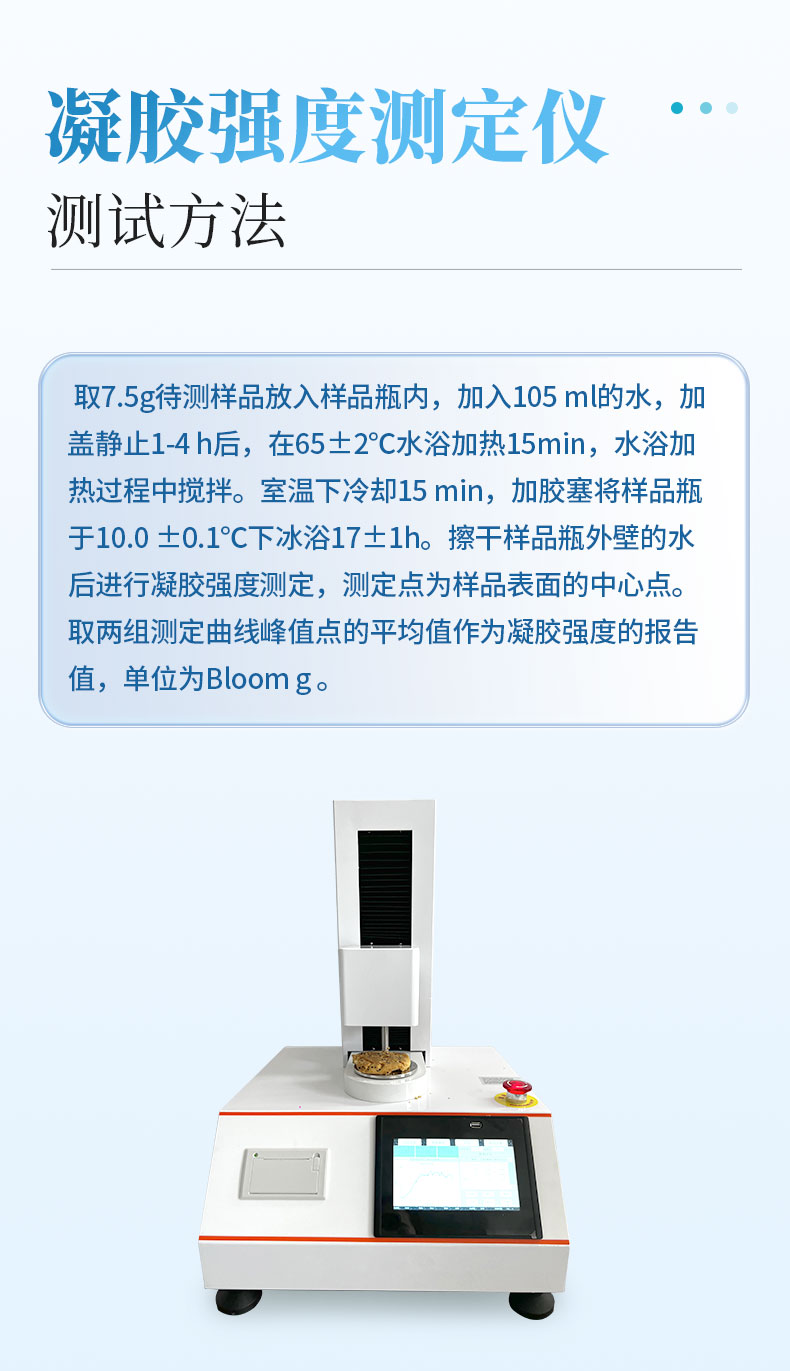 凝膠強(qiáng)度測定儀測試方法: 取7.5g待測樣品放入樣品瓶內(nèi),加入105 ml的水,加蓋靜止1-4 h后,在65±2℃水浴加熱15min,水浴加熱過程中攪拌。室溫下冷卻15 min,加膠塞將樣品瓶于10.0 ±0.1℃下冰浴17±1h。擦干樣品瓶外壁的水后進(jìn)行凝膠強(qiáng)度測定,測定點(diǎn)為樣品表面的中心點(diǎn)。取兩組測定曲線峰值點(diǎn)的平均值作為凝膠強(qiáng)度的報告值,單位為Bloom g 。