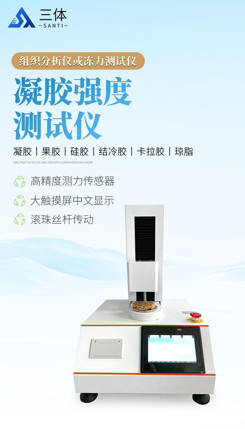 凝膠強(qiáng)度測儀適用于凝膠、果膠、硅膠、結(jié)冷膠、卡拉膠、瓊脂、阿拉伯膠、黃原膠、魔芋膠和瓜爾膠等的破裂強(qiáng)度、彈性、延展性、拉伸強(qiáng)度、粘附度、回復(fù)性等測試。凝膠強(qiáng)度測儀也叫凍力強(qiáng)度儀 ,明膠凝凍強(qiáng)度測定儀,組織分析儀或凍力測試儀。