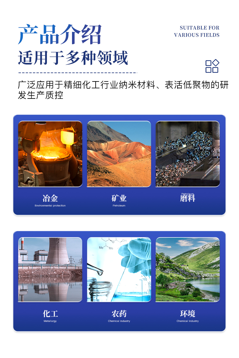 激光粒度分析儀同時具有Zeta電位及納米粒徑的分析測試功能,適用于多種不同的納米乳液、懸浮液膠體等的粒度和表面電位測量,能廣泛應(yīng)用于精細(xì)化工行業(yè)納米材料、表活、低聚物等的研發(fā)和生產(chǎn)質(zhì)控,同時也是油墨,醫(yī)藥制劑等行業(yè)產(chǎn)品研發(fā)及質(zhì)控檢測儀器。