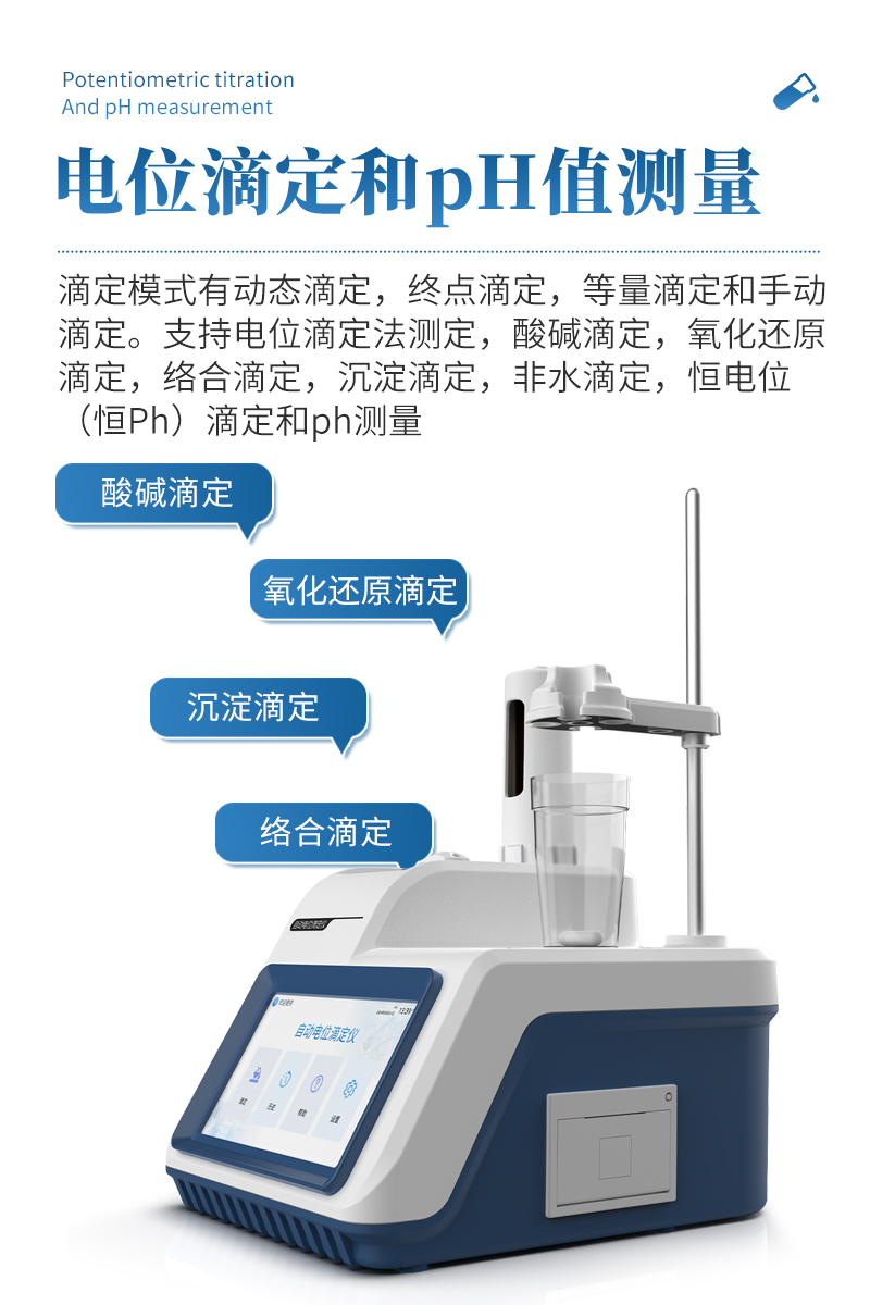 自動電位滴定儀是一種用于化學(xué)分析的精密儀器,他通過自動添加滴定劑來確定樣品中特定成分的濃度。該儀器基于電位滴定原理工作,即根據(jù)在滴定過程中電池電動勢的變化來確定滴定終點的一款滴定設(shè)備。設(shè)備滿足國家檢定規(guī)程JJG 814-2015《自動電位滴定儀》儀器級別中的0.05級別,即儀器**示值誤差為±1.5%,儀器示值重復(fù)性≤0.2%