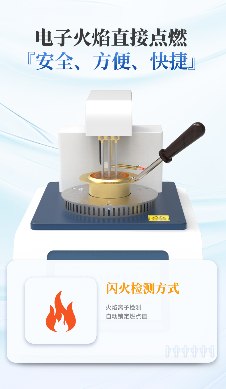 全自動(dòng)開(kāi)口閃點(diǎn)和燃點(diǎn)測(cè)定儀主要用于石油產(chǎn)品和其他易燃液體在特定條件下,與空氣混合后遇火源發(fā)生閃火和燃燒的**溫度的儀器。