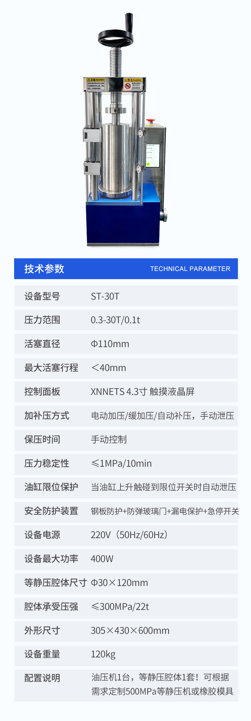 | 配置說明 | 油壓機1臺,等靜壓腔體1套!可根據(jù)需求定制500MPa等靜壓機或橡膠模具 |