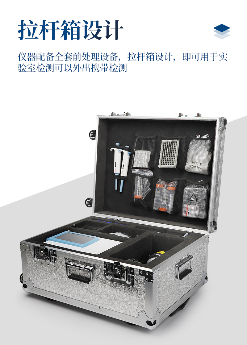 12、儀器配備全套前處理設(shè)備,拉桿箱設(shè)計,即可用于實驗室檢測可以外出攜帶檢測。