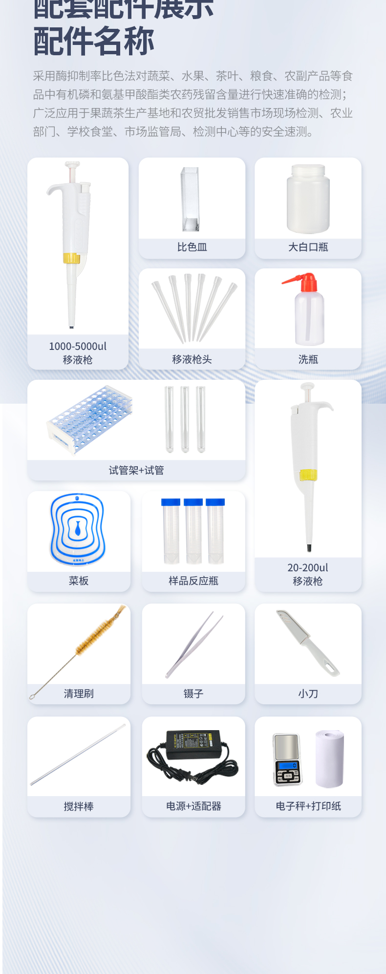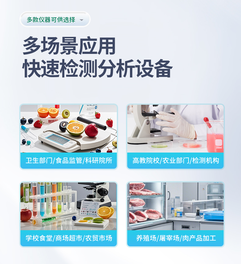 采用酶抑制率比色法對(duì)蔬菜、水果、茶葉、糧食、農(nóng)副產(chǎn)品等食品中有機(jī)磷和氨基甲酸酯類農(nóng)藥殘留含量進(jìn)行快速準(zhǔn)確的檢測(cè);廣泛應(yīng)用于果蔬茶生產(chǎn)基地和農(nóng)貿(mào)批發(fā)銷售市場(chǎng)現(xiàn)場(chǎng)檢測(cè)、農(nóng)業(yè)部門、學(xué)校食堂、市場(chǎng)監(jiān)管局、檢測(cè)中心等的安全速測(cè)。