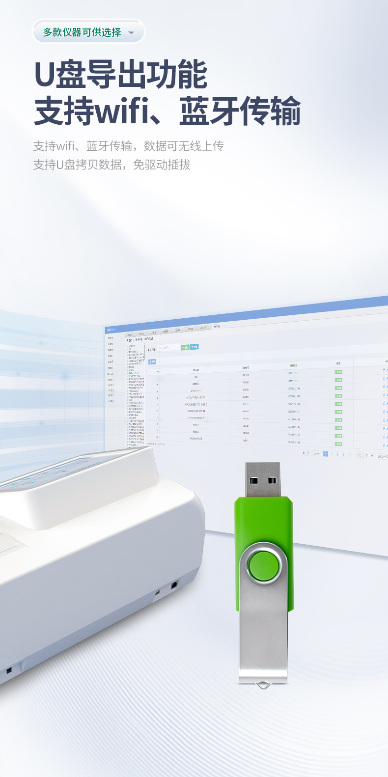 5、支持wifi、藍(lán)牙傳輸,數(shù)據(jù)可無(wú)線上傳;支持U盤拷貝數(shù)據(jù),免驅(qū)動(dòng)插拔。
