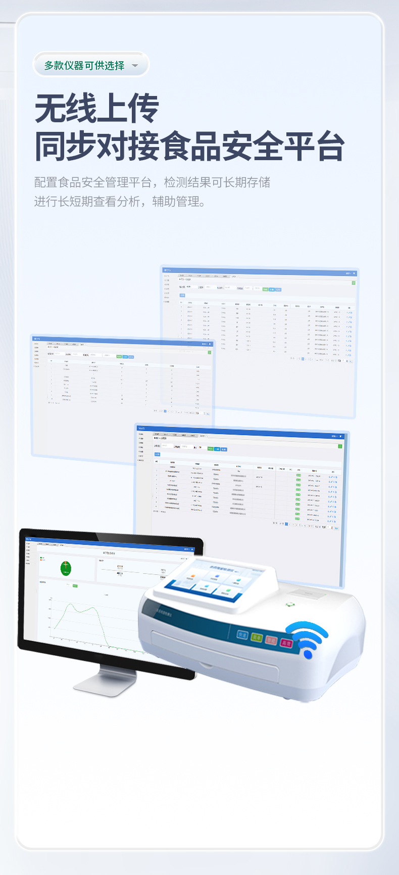 6、配置食品安全管理平臺(tái),檢測(cè)結(jié)果可長(zhǎng)期存儲(chǔ),進(jìn)行長(zhǎng)短期查看分析,輔助管理。