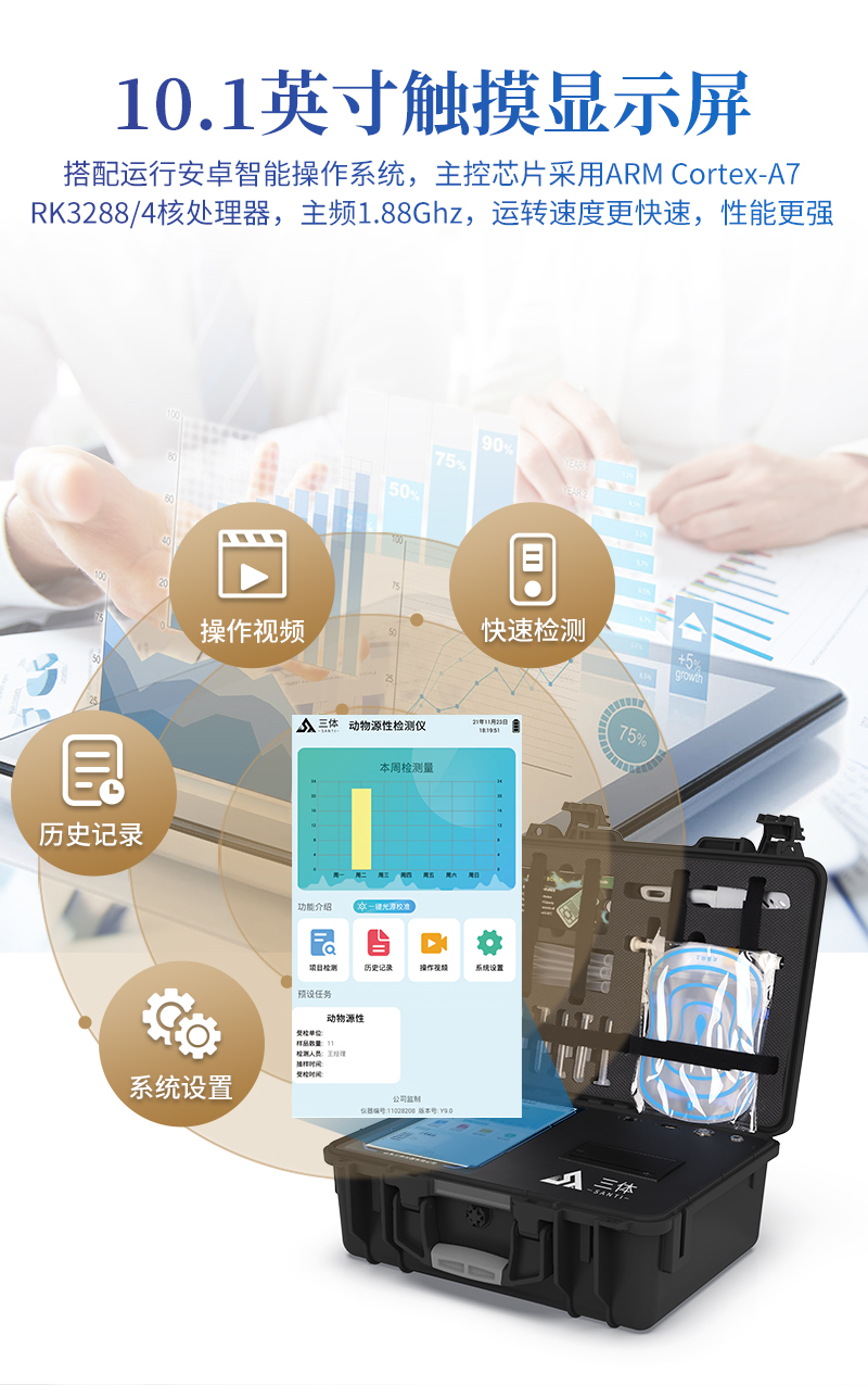 1、儀器采用10.1英寸液晶觸摸屏顯,搭配運(yùn)行安卓智能操作系統(tǒng),主控芯片采用ARM Cortex-A7,RK3288/4核處理器,主頻1.88Ghz,運(yùn)轉(zhuǎn)速度更快速,性能更強(qiáng)。