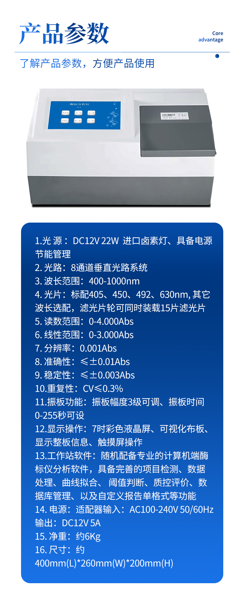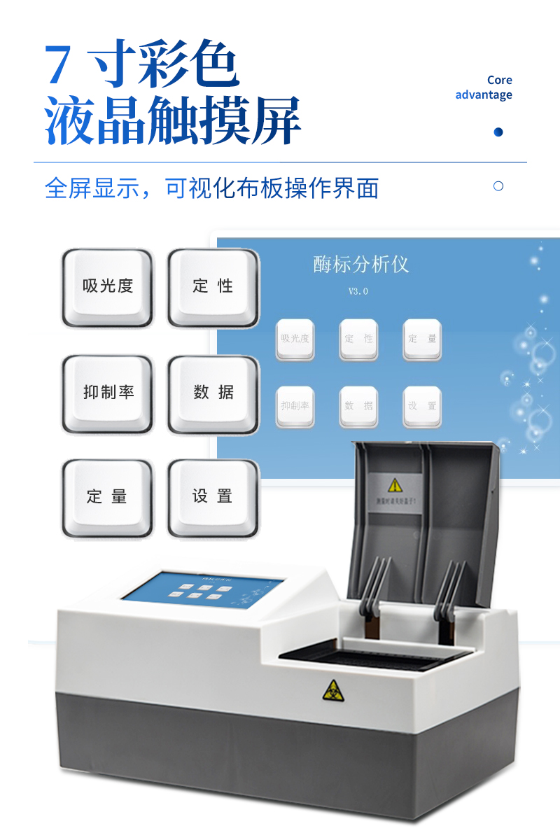 產(chǎn)品特點回設計精巧、操作簡單、攜帶方便 回7時彩色液晶顯示、觸摸屏操作回板面可視化布板、測量數(shù)據(jù)整板顯示回中心定位、數(shù)據(jù)準確、穩(wěn)定性好、重復性好回終點法、動力學法、抑制率、單/雙波長測量回采用寬電壓設計、全球網(wǎng)電源適用技術(shù)參數(shù)1. 光 源 :DC12V 22W 進口鹵素燈、具備電