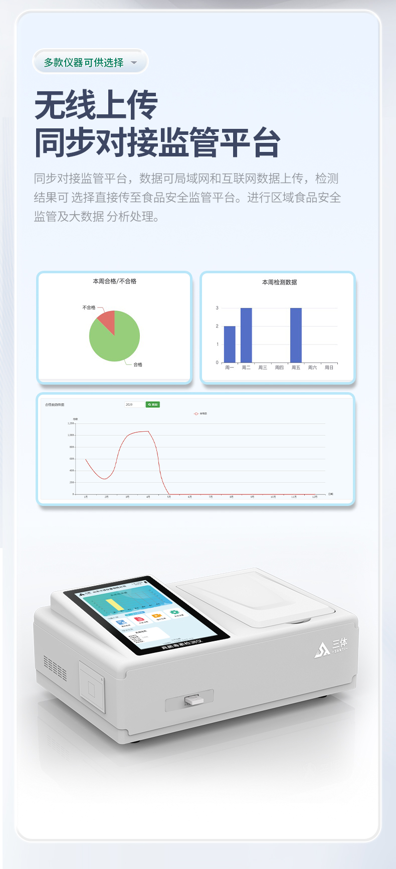 11、儀器具有 wifi 聯(lián)網(wǎng)上傳、RJ45網(wǎng)線連接功能,可以快速上傳數(shù)據(jù)。同步對接監(jiān)管平臺(tái),數(shù)據(jù)可局域網(wǎng)和互聯(lián)網(wǎng)數(shù)據(jù)上傳,檢測結(jié)果直接傳至食品安全監(jiān)管平臺(tái)。進(jìn)行區(qū)域食品安全監(jiān)管及大數(shù)據(jù)分析處理與數(shù)據(jù)統(tǒng)計(jì),檢測區(qū)域食品安全長短期動(dòng)態(tài),達(dá)到食品安全問題預(yù)估、預(yù)警。