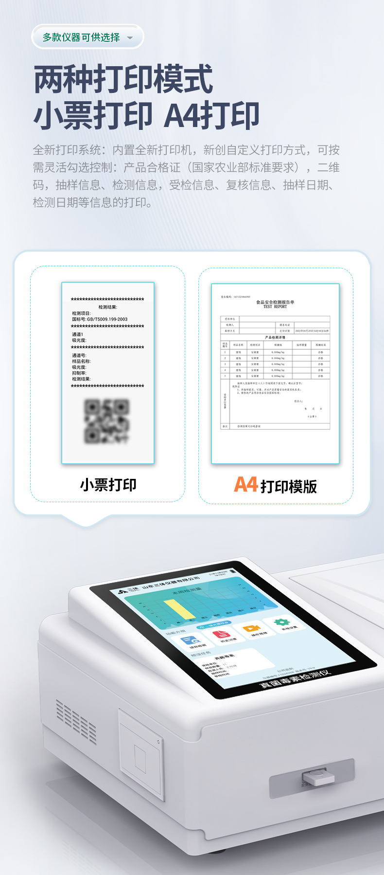 10、A4紙版本報(bào)告打印功能:設(shè)備擁有兩種結(jié)果展示方式,可以自動(dòng)生成A4打印模板和小票打印模板兩種樣式,可通過WiFi及網(wǎng)線等方式鏈接外置打印機(jī)可進(jìn)行打印