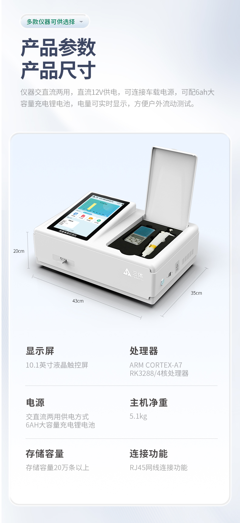 3.一體化臺(tái)式快檢設(shè)備,采用交直流兩用供電方式,可連接車載電源,配備6ah大容量充電鋰電池,可以滿足現(xiàn)場及流動(dòng)檢測使用的需求。儀器尺寸:43×35×20cm, 主機(jī)凈重:5.1kg