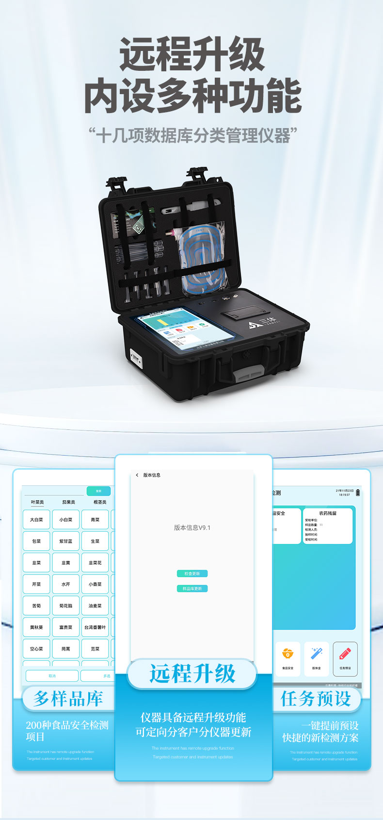 13、儀器具備遠(yuǎn)程升級功能,可定向分客戶分儀器更新,開機(jī)后自動更新,并可持續(xù)性免費(fèi)更新系統(tǒng)版本,無需像傳統(tǒng)產(chǎn)品返廠更新,節(jié)省時間及人力成本并避免了物流運(yùn)輸返廠升級導(dǎo)致設(shè)備損壞的潛在風(fēng)險。