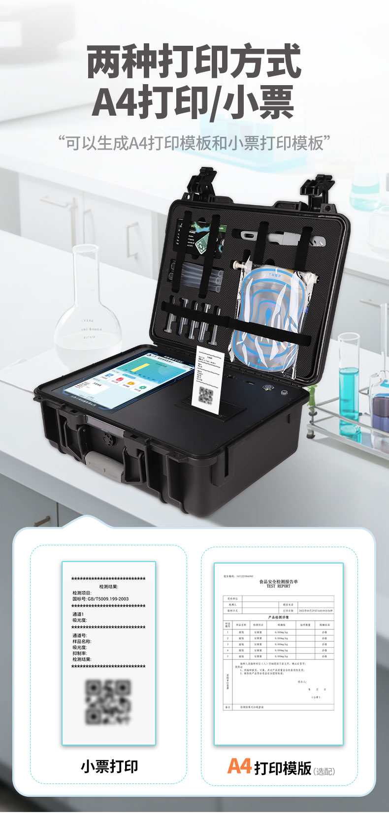 10、A4紙版本報(bào)告打印功能:設(shè)備擁有兩種結(jié)果展示方式,可以自動生成A4打印模板和小票打印模板兩種樣式,可通過WiFi及網(wǎng)線等方式鏈接外置打印機(jī)可進(jìn)行打印